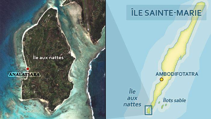 Sainte-Marie est un petit archipel situé sur la côte nord-est de Madagascar, constitué de 8 îles et îlots : l’île Sainte-Marie, l’îlot Madame, l’île aux Forbans, l’île aux Baleines, les 3 îlots sables et enfin surtout l’île aux Nattes.